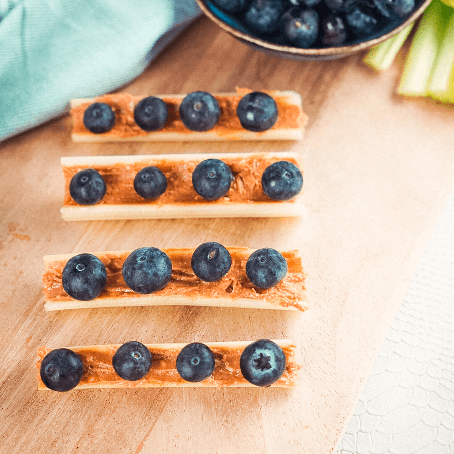Origineel en voedzaam tussendoortje Voor een originele en voedzame snack is deze combinatie van selderijsticks met pindakaas en blauwe bessen