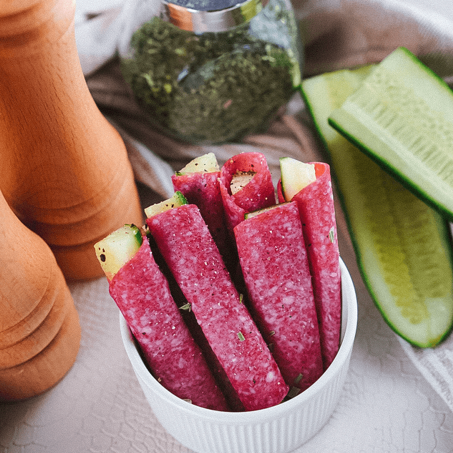 Frisse snack met een hartige twist Deze komkommerrolletjes met salami zijn een perfecte combinatie van knapperige komkommer en hartige salami.