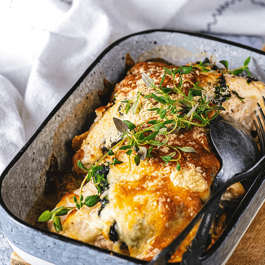 • Leg de kipfilets in een ovenschaal en schep de gebakken spinazie er bovenop.