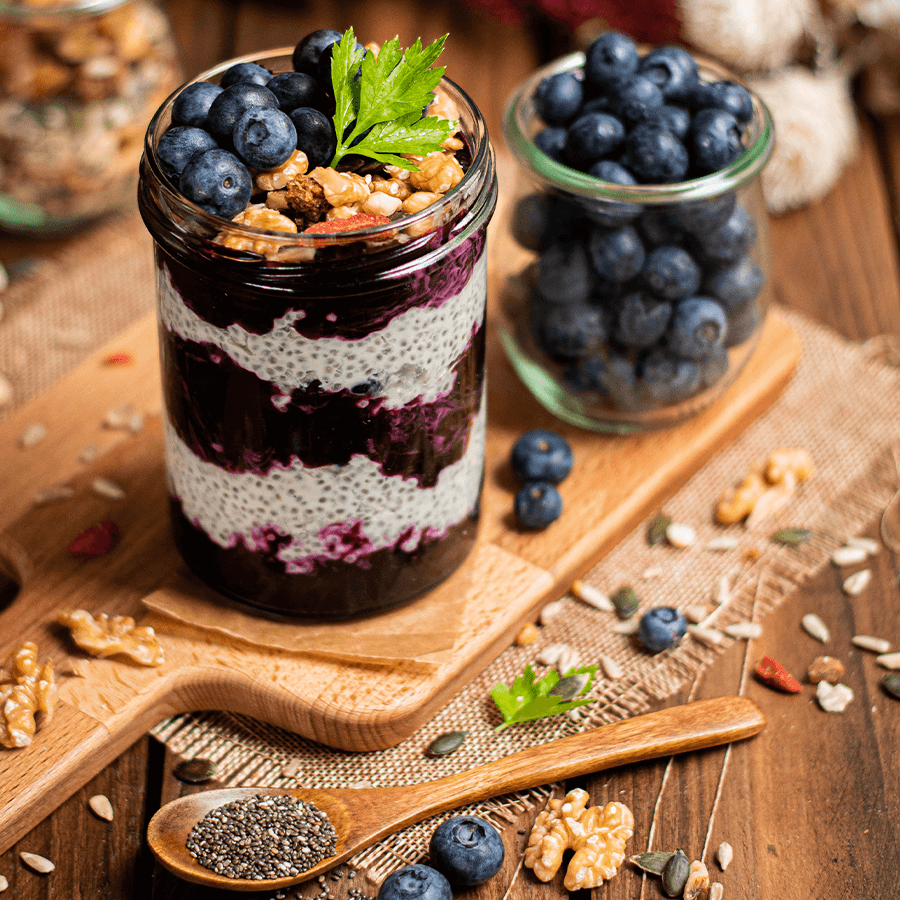 Chia zaden zijn rijk aan vezels, eiwitten en gezonde vetten. Ze helpen om de bloedsuikerspiegel te stabiliseren en dragen bij aan een langdurig verzadigd gevoel. Door chia zaden te combineren met blauwe bessen, die rijk zijn aan antioxidanten en vitamine C, krijg je een heerlijk en voedzaam ontbijt of dessert dat zorgt voor een goede start van de dag.