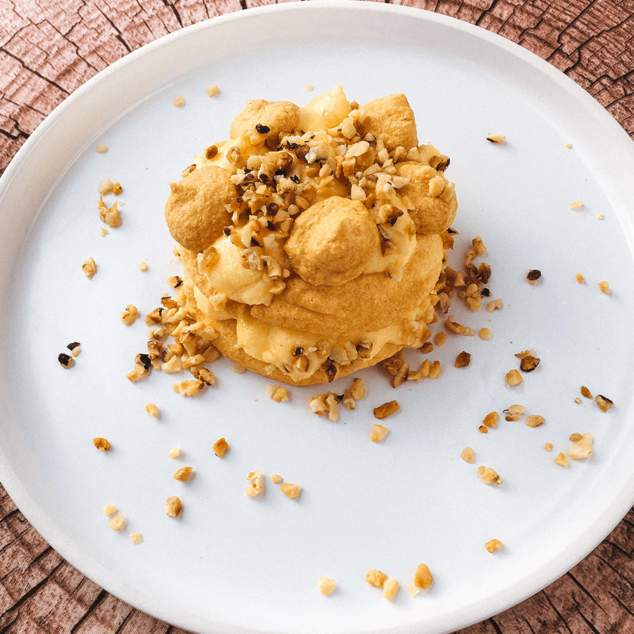 - Nu kan je het gebakje garneren. De volgorde is: schuimpje, room, schuimpje, room.