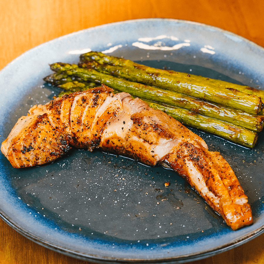 - Leg de asperges en zalm op een bord en voeg peper en zout toe.