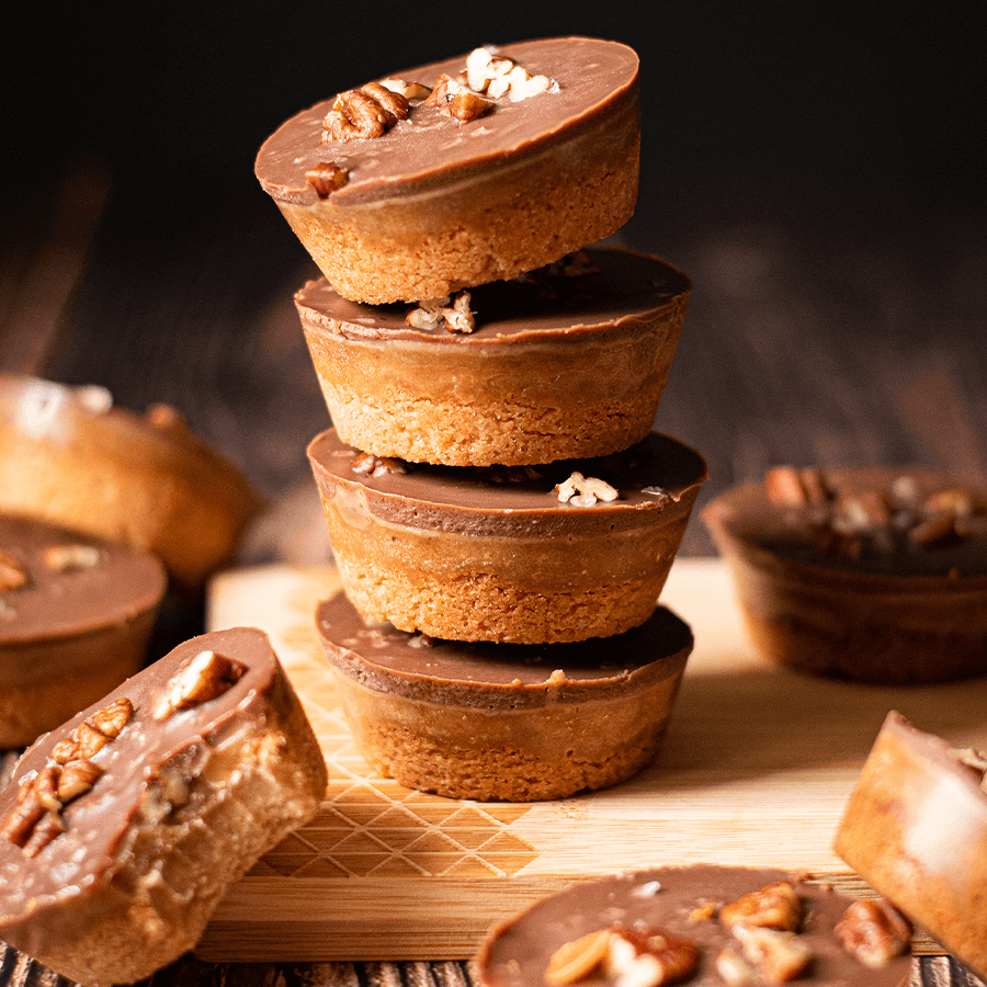 - Smelt de boter in een sauspannetje en voeg de suikervrije stroop, bruine suikervervanger en slagroom toe. Laat dit koken totdat de caramel indikt. Hak de pecannoten en verdeel 30 gram hiervan door de caramel. Schenk dit over de inmiddels afgekoelde bodems en laat volledig afkoelen.