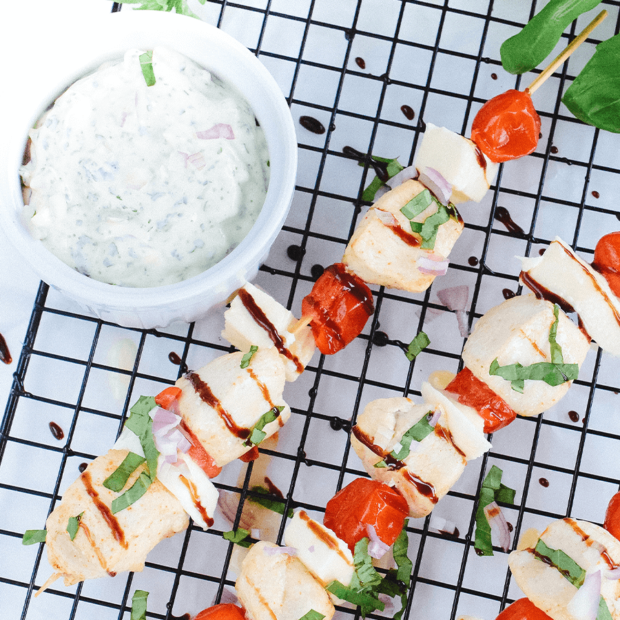 - Voeg de mozzarella-kaasbolletjes toe aan de spies.