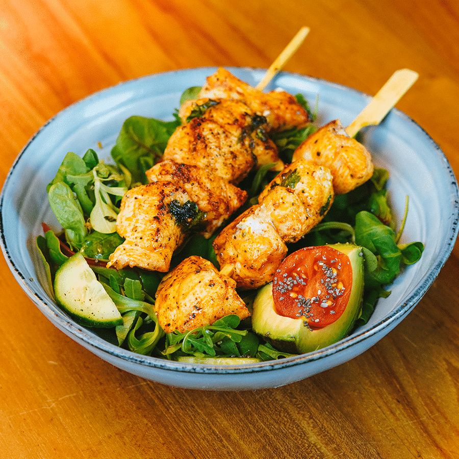Gezonde koolhydraatarme gemarineerde kipspiesjes met salade