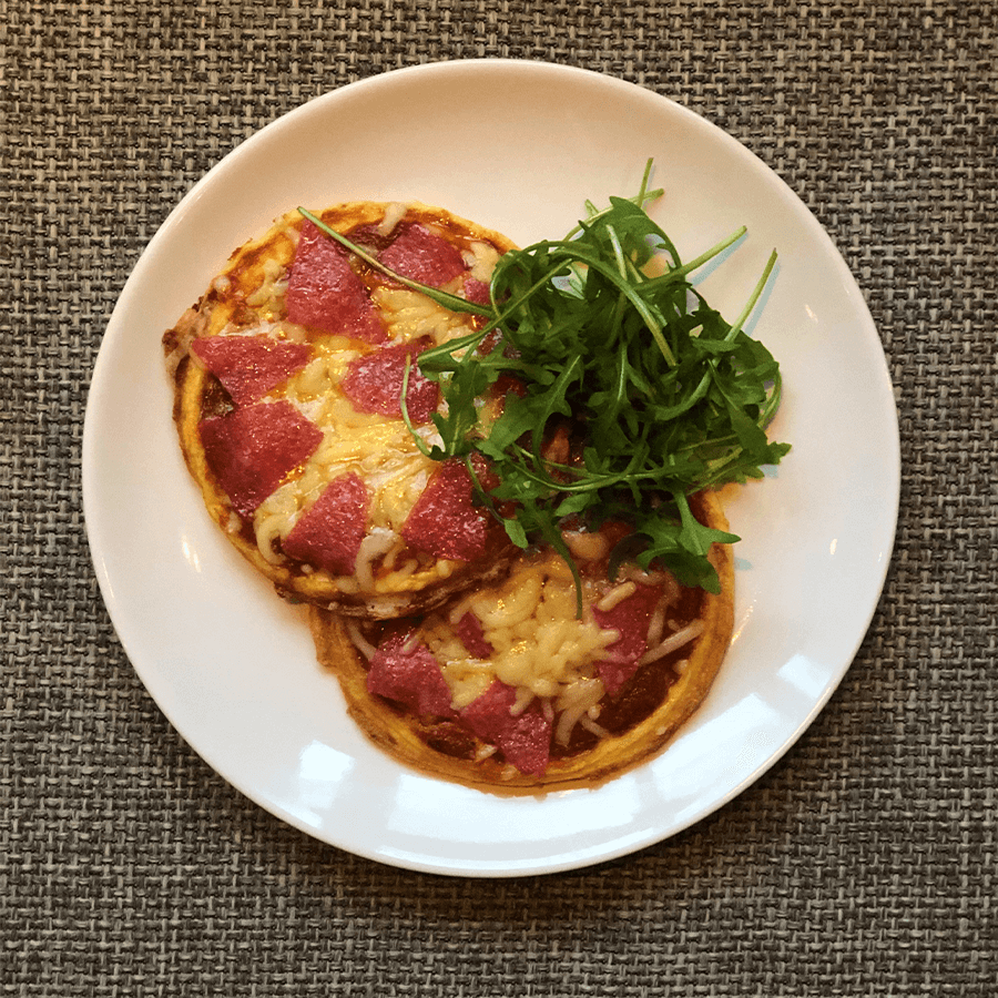 • Beleg de twee chaffles mini pizza’s met de tomatensaus, kaas en salami.