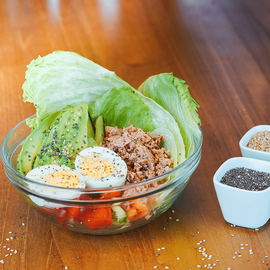 - Neem wat blaadjes ijsbergsla en leg ze als een kommetje neer. Besmeer ze met mayonaise en leg daarop de tonijn en vervolgens de overige groenten. Voeg eventueel wat sojasaus en sesamzaad toe. Vul zo alle blaadjes ijsbergsla.