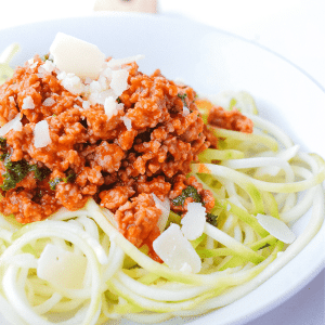 Een heerlijke pasta bolognese op een koolhydraatarme manier. Door de ongezonde pasta te vervangen door de courgetti heb je een heerlijk recept rijk aan mineralen en vitaminen!