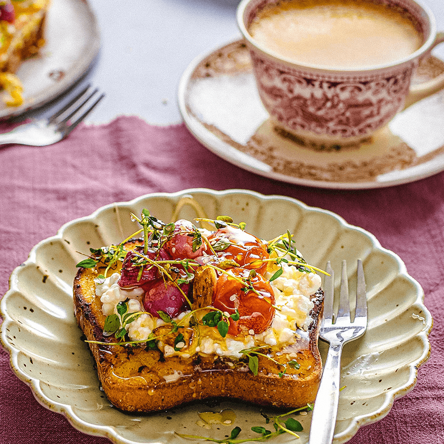 - Schik elk snede “French Toast” op een bord, beleg met de cottage cheese en de geroosterde groenten, garneer met verse kruiden, en werk af met de suikervrije honing, peper en zout.