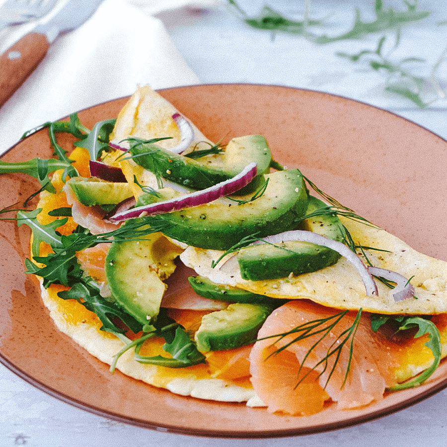 - Beleg je omelet met 3 plakjes gerookte zalm, een halve avocado in stukjes gesneden, handjevol rucola en ¼ fijngesnipperde rode ui.