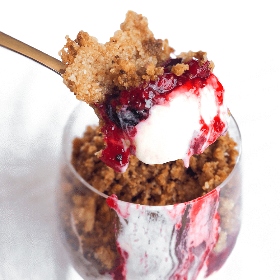 - Vul een glaasje met de cheesecake laag, warme bosvruchten saus en eindig met de crumble laag.