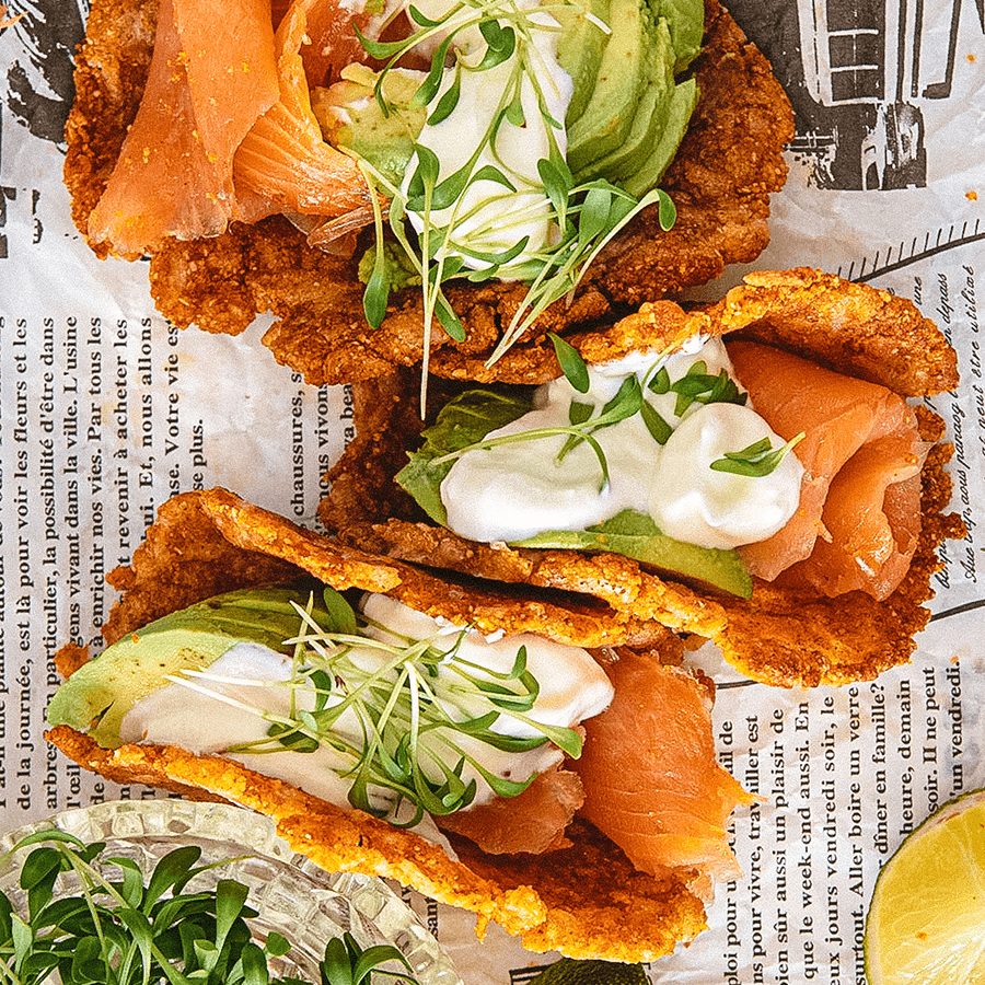 - Haal de tacoschelpen uit de oven en laat afkoelen (leg ze over een deegroller om de vorm te krijgen) voordat je ze vult met je favoriete keto-vriendelijke ingrediënten (zoals guacomole).