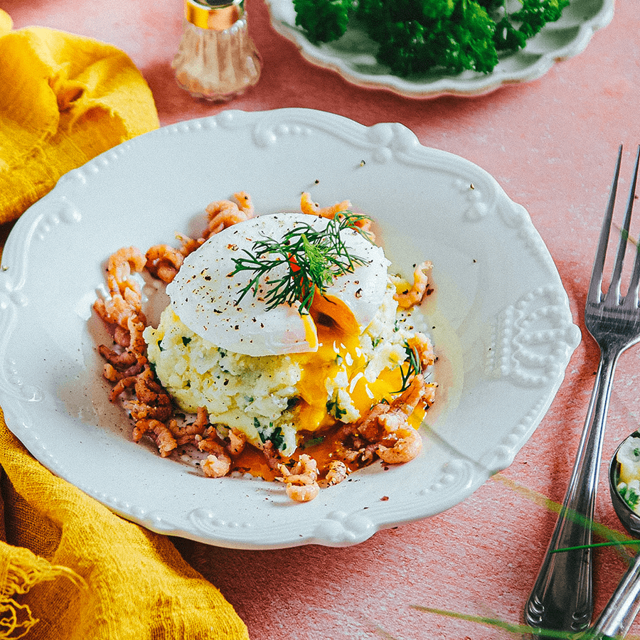 - Schep de kruidenpuree van de bloemkool op een bord, leg de garnalen er op en tot slot het gepocheerde ei daar weer boven op. Garneer met gehakte peterselie en serveer direct.