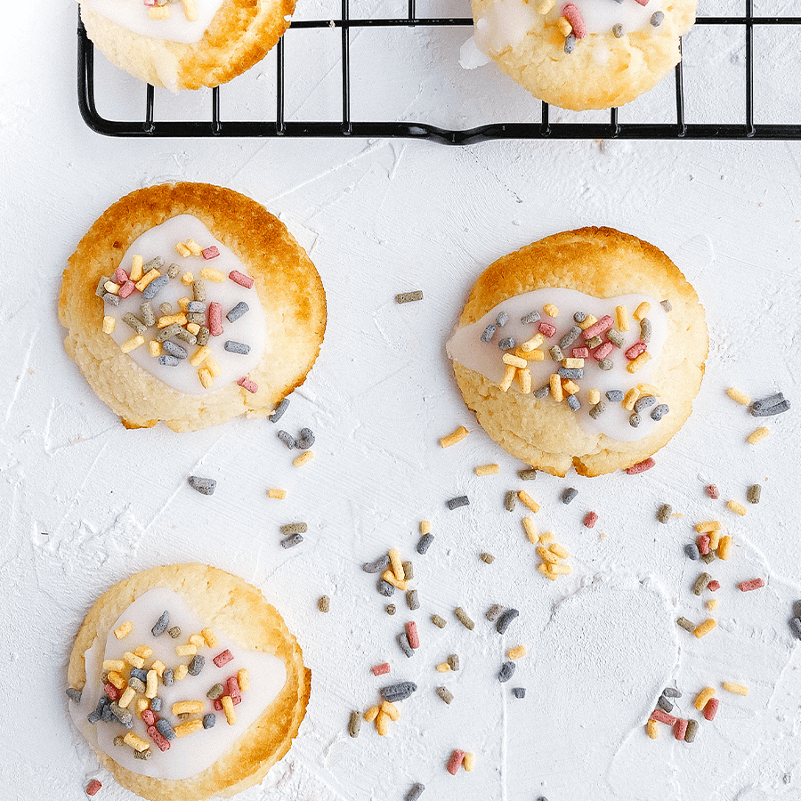 • Giet het mengsel over de koekjes en bestrooi met de suikervrije gekleurde hagelslag. Laat het glazuur nu hard worden alvorens te serveren.