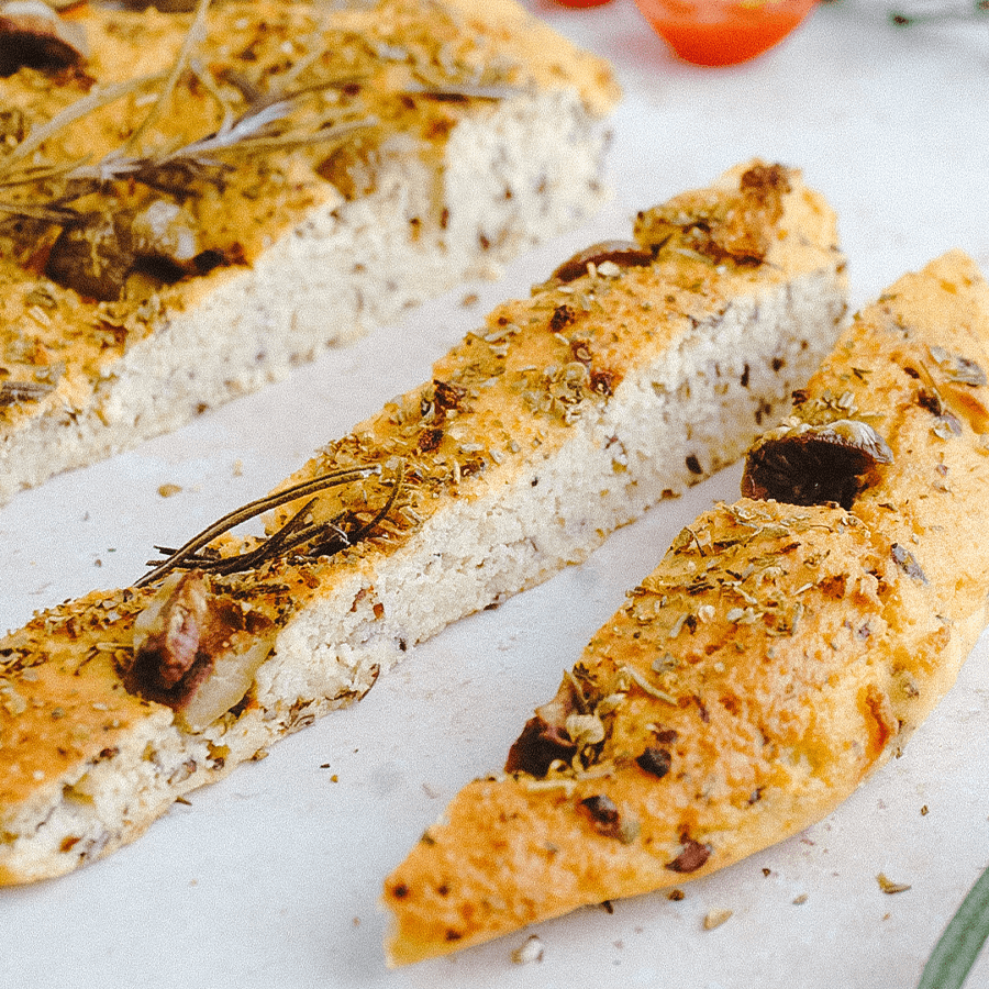 - Bestrooi de bovenkant met oregano, bedek met verse takjes rozemarijn en gehalveerde olijfjes.