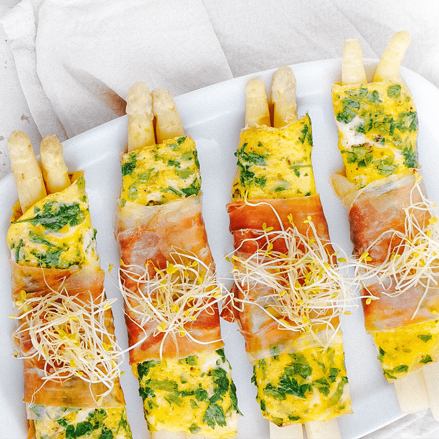 - Rol 2 asperges in een omelet en doe er ook een sneetje serranoham rond.