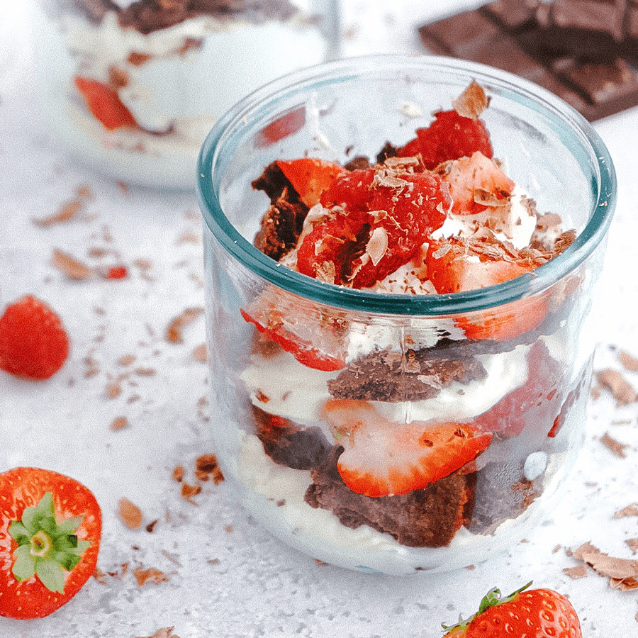 - Start het met opbouwen van jouw glaasjes: een laagje fruit, een laagje brownie-stukjes, een laagje fruit, een laagje mousse. Werk af geschaafde chocolade en nog extra fruit.
