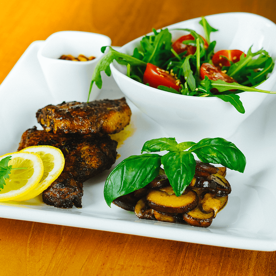 - Pak een bord en meng de gehalveerde cherrytomaatjes met de rucolasla, leg de schijfjes citroen op de lamskoteletjes en een aantal basilicum blaadjes op de kastanjechampignons.