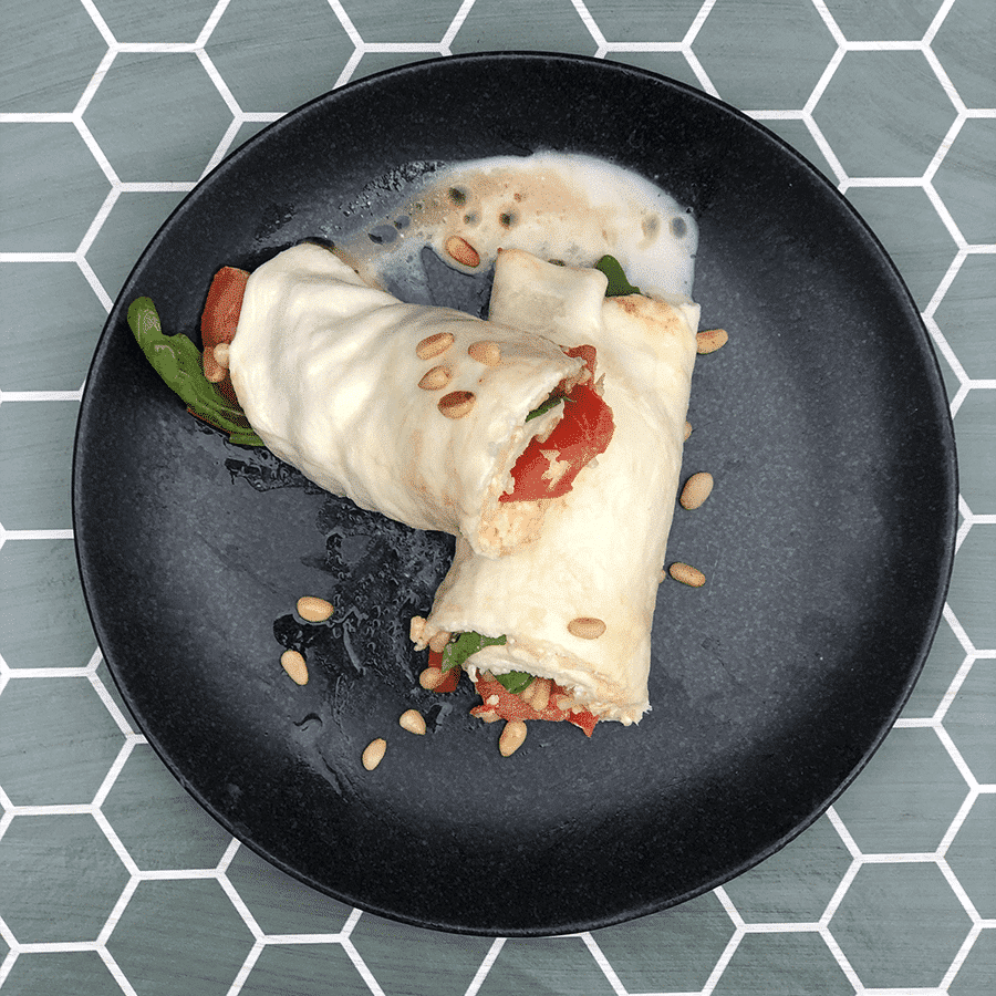 - Beleg de mozzarella wrap daarna met de plakjes tomaat, de blaadjes basilicum, 5 ml balsamicoazijn, de geraspte kaas, zout en peper en de pijnboompitjes en rol hem op.