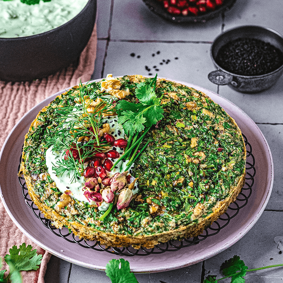 - Wanneer het afgekoeld is, ga je met een dun mes langs de randen om de Kuku (of frittata) los te maken. Keer om op een bord en verwijder het bakpapier, keer het dan opnieuw om op een snijplank.