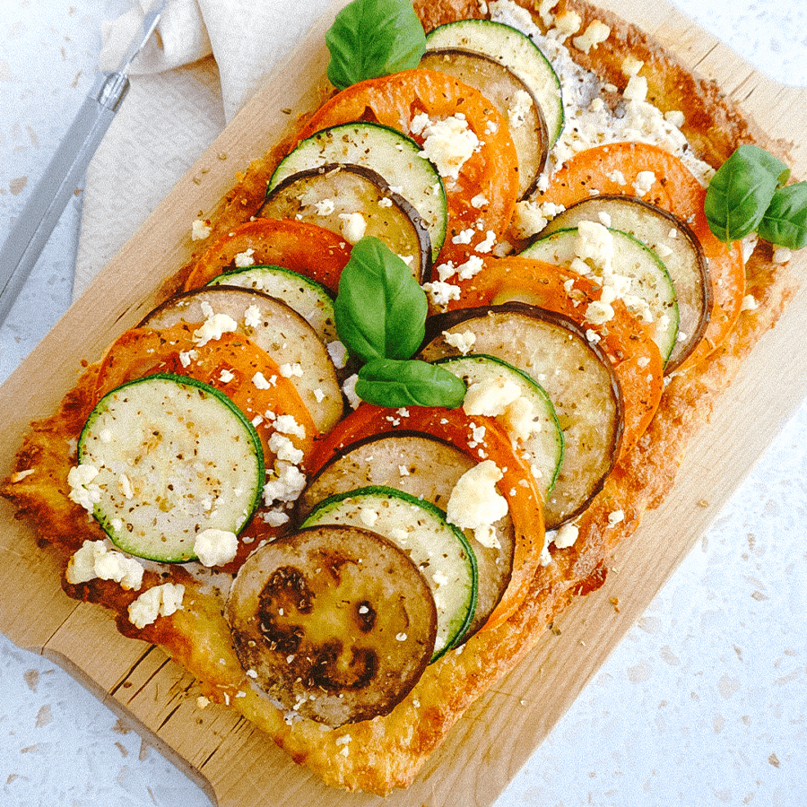 - Snijd ½ courgette en ½ aubergine in schijfjes. Plaats in een kom en meng met 2 eetlepels olijfolie, oregano, peper en zout.