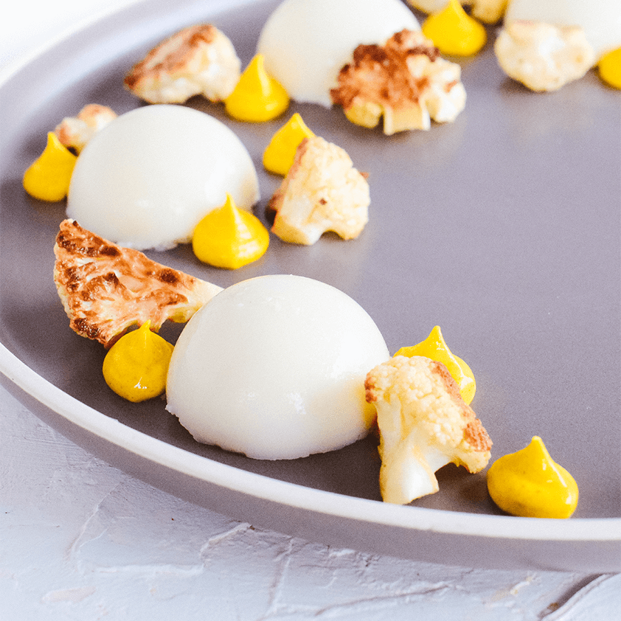 • Serveer de panna cotta met de geroosterde bloemkoolroosjes en een dot currymayonaise.