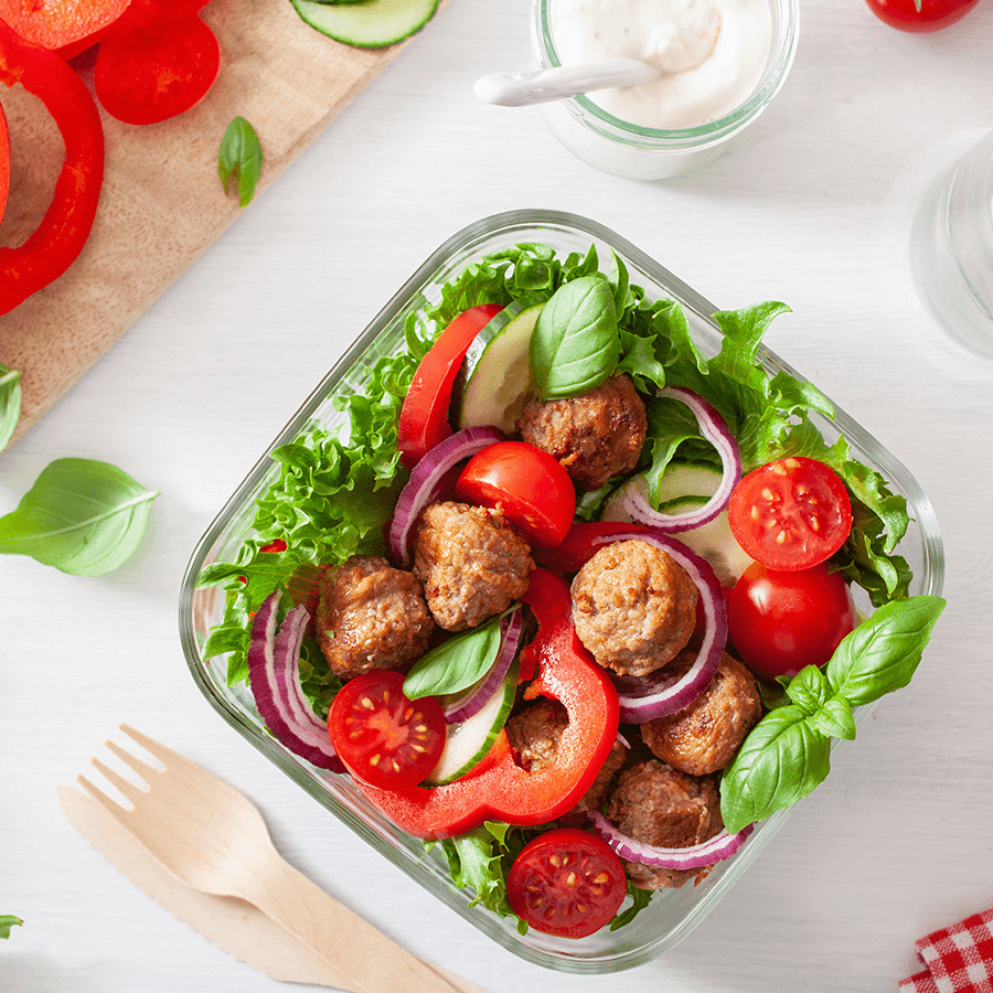 - Bak de gehaktballetjes gaar en voeg toe aan de salade.