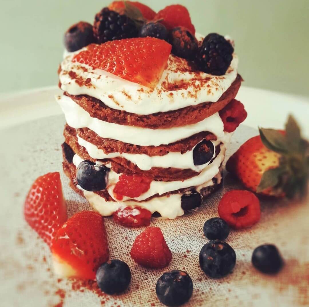 • Leg op elke pannenkoek een beetje Griekse yoghurt met rode vruchten. Maak laagjes.