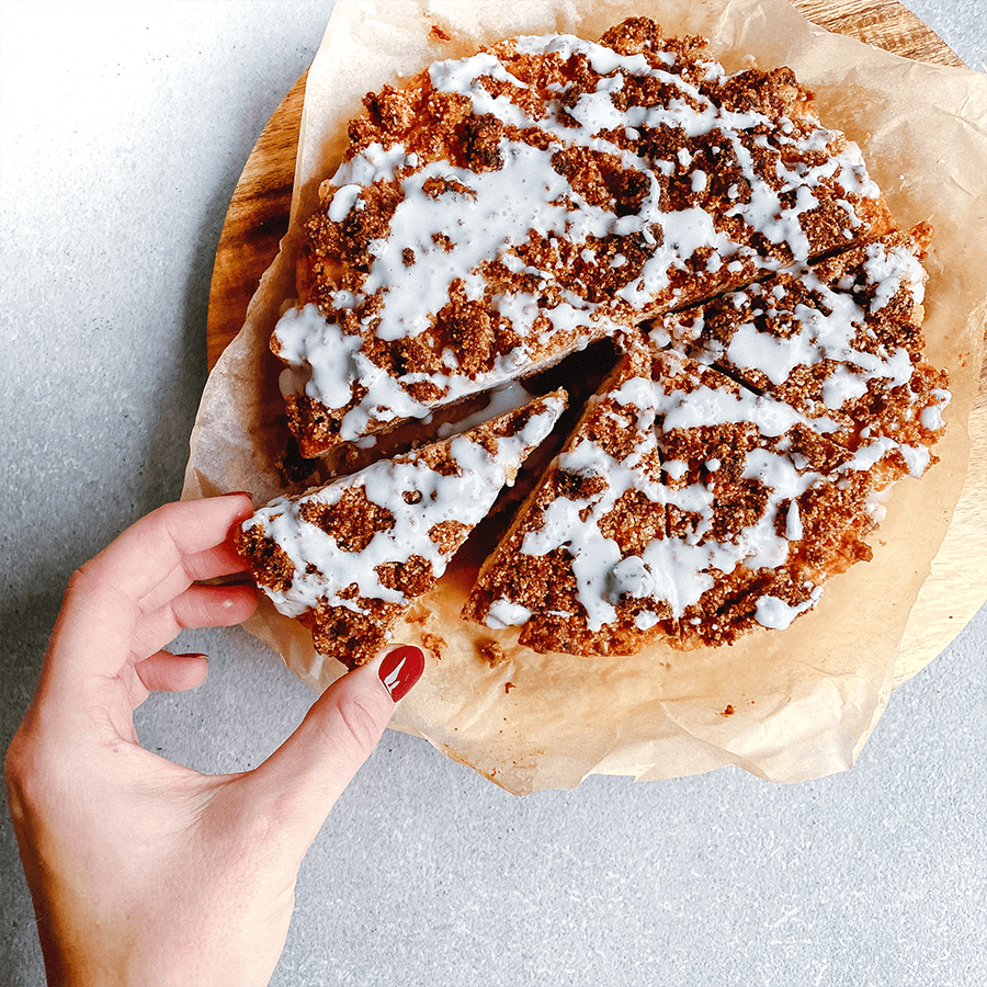 - Laat de cake afkoelen en maak ondertussen het optionele glazuurlaagje: meng 1el amandelmelk met 2-3 eetlepels Steviala frost.