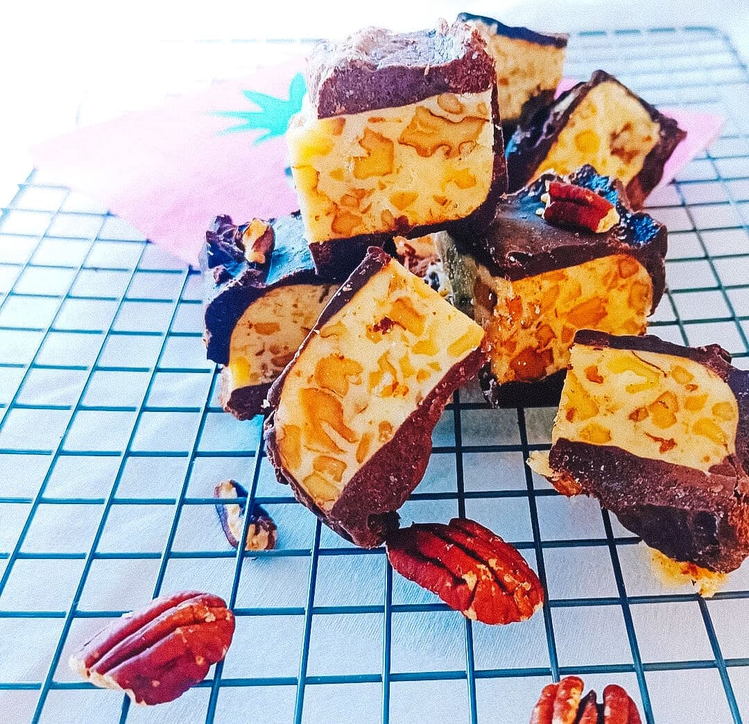 • Als het notenmengelsel hard is, verwarm dan 100 gram chocolade met een beetje room. Giet dit over het notenmengsel.