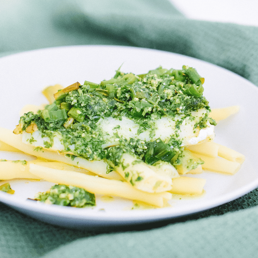 - Leg hierop de boontjes, de uienringen en daarop de vis. Bestrooi met peper en zout en tot slot de pesto erop.